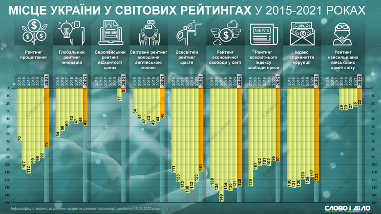 Украина за последнее время улучшила свою позицию сразу в нескольких рейтингах. Так, мы поднялись на две позиции в рейтинге паспортов мира (украинцы могут путешествовать без визы или с визой по прибытии в 141 страну); на три позиции – в рейтинге самых сильных армий; на 14 позиций – в глобальном рейтинге качества жизни. В то же время за последний год был регресс в индексе восприятия коррупции. На инфографике «Слово и дело» – как менялось место Украины в международных рейтингах за последние семь лет.