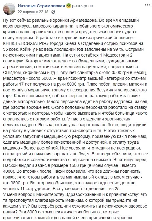 «Получает санитарка около 3500 грн в месяц, Медсестра — около 5000. Я врач-психиатр высшей категории со стажем работы 17 лет получаю на руки 8000 грн. Плюс побои, плевки, матюки и постоянную моральную травму от созерцания безумия и человеческого горя», — подчеркнула Наталья Стримовская.