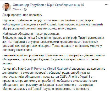 Главный врач больницы областной им.Мечникова, Сергей Рыженко, просит всех о помощи. В больнице вышли из строя старые, но жизненно необходимые для больницы и больных аппараты. Больница нуждается в срочной замене их .