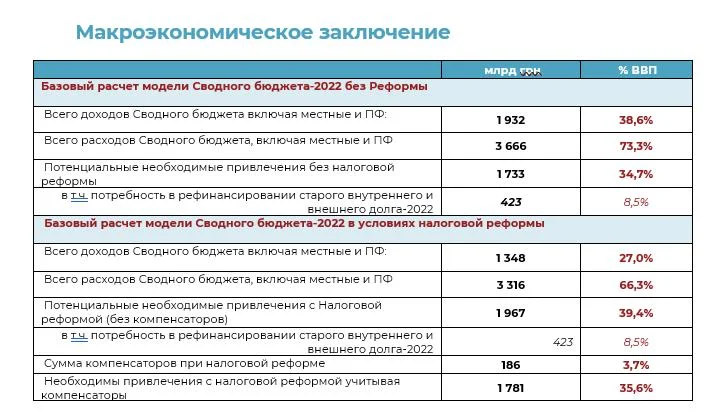 В то же время, при условии запуска реформы произойдет критическое улучшение налогового климата в стране, что будет способствовать активизации деловой активности, увеличению капитальных инвестиций и в стратегической перспективе — значительное увеличение налоговых поступлений с возможностью достижения профицита бюджета.
