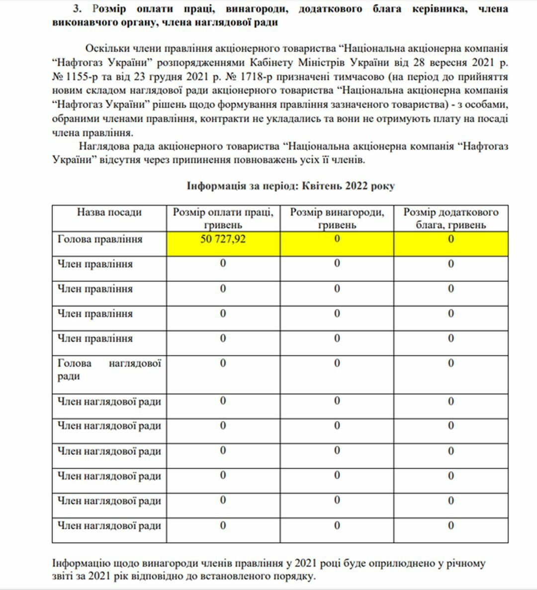 Если верить данным сайта «Нафтогаза», заработная плата нынешнего главы правления составляет около 50 тыс. грн в месяц, в частности, в апреле 2022-го он получил 50 727,92 грн. (С остальными «временными» вроде бы нет контрактов, поэтому суммы выплат и вознаграждений не разглашаются.)