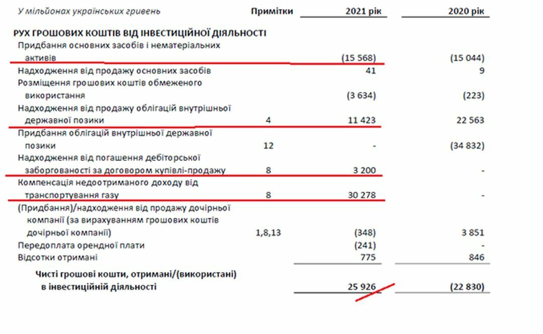 Поскольку чистый денежный поток от операционной деятельности был сформирован с дефицитом в 24,4 млрд грн, то капитальные инвестиции были профинансированы, по сути, только благодаря продаже ОВГЗ на сумму 11,4 млрд грн и поступлением от АО «Магистральные газопроводы» в счет покупки ООО «Оператор газотранспортной системы» 3,2 млрд грн.