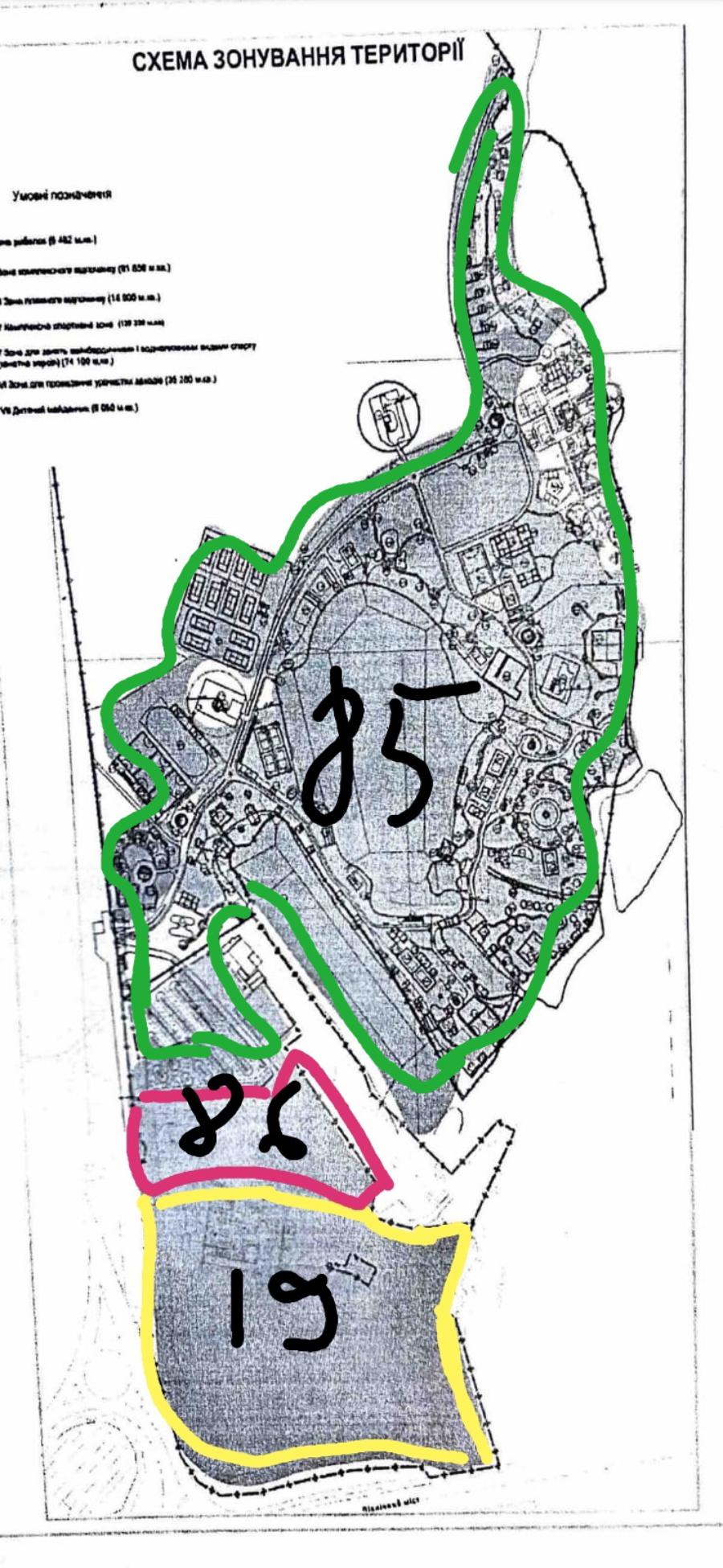 А участок 86, которым занимался КО «Киевзеленстрой», превратился в участок 54 чуть меньшего размера — площадью 3,672 га (для культурно-оздоровительных нужд, рекреационных, спортивных и туристических целей).