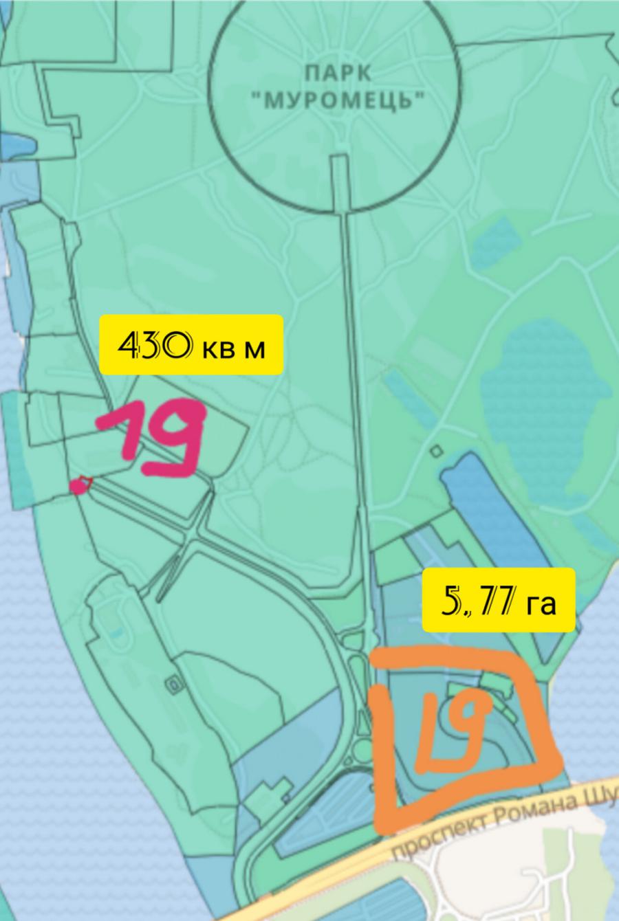 Участок 19, подведомственный УК «Киевавтодор» и передан под создание «спортивного парка» ООО «Инновационный спортивный парк»: оранжевым — границы участка в 2021 году, розовая точка — 430 кв. метров – площадь и расположение участка после новой регистрации в Госгеокадастре