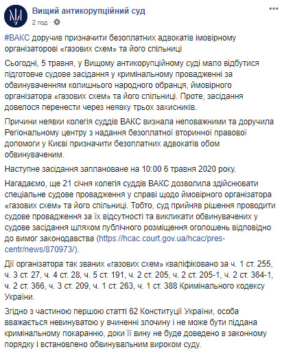 Отмечается, что 5 мая должно было состояться подготовительное заседание по делу о «газовых схемах», но трое адвокатов не явились.