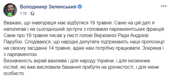«Считаю, что инаугурация должна состояться 19 мая. Именно на этой дате я настаивал и на сегодняшней встрече с председателями парламентских фракций. Именно о 19 мая писал в письме председателю Верховной Рады Андрею Парубию. Надеюсь, что народные депутаты поддержат наши предложения на своем заседании 14 мая, ведь нам нужно работать. В том числе и с парламентом. Определенность крайне важна и для народа Украины, и для иностранных гостей, которые уже выразили желание прибыть на торжества, и для меня лично», — заявляет Зеленский.