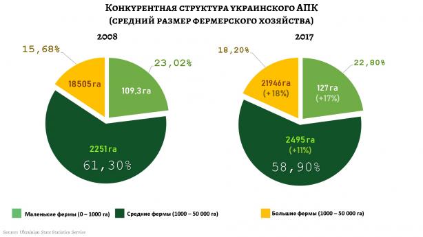 С другой стороны, для крупных компаний от 50 тыс. га нет проблемы в привлечении гораздо более дешевых ресурсов на мировых рынках капитала через эмиссию еврооблигаций или выход на IPO. Подобное неравенство возможностей уже привело к существенной олигополизации украинского АПК. Помимо ярко выделяющихся кейсов компаний с одними из самых крупных земельных банков в мире (Кернела — 550 тыс. га, Укрлендфарминга — 500 тыс. га и NCH — 400 тыс. га) важно обратить внимание и на общеотраслевые показатели. Только за 2009–2017 гг. произошло существенное укрупнение во всех трех категориях фермерства: на 18% больших (с более чем 10 тыс. га в обработке), 17% малых (до 1 тыс. га) и 11% средних (от 1 до 10 тыс. га). То есть происходит повышение барьеров для начала фермерской деятельности и ослабление конкурентной борьбы между текущими операторами рынка.