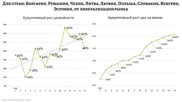 Кумулятивный прирост цен на землю в Восточно-европейском поясе стран, отображающий ее доходность как бизнес-единицы, по сравнению с 2003 г., составил 208%. При этом, в отличие от «старой Европы», основным фактором роста цен выступило увеличение урожайности (в среднем на 53%) и улучшение структуры производства в сторону сложных и дорогих культур. Земля, где растет пшеница первого сорта, гораздо дороже аналогичной с фуражными видами, не говоря о высокомаржинальных подотраслях растениеводства.