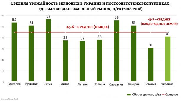 В то же время Украина, земля с наилучшими стартовыми возможностями, сегодня собирает в среднем 41 центнер зерновых с гектара, что ниже на 11% показателей постсоветских стран Восточной Европы. Если же отбросить страны Прибалтики, где качество пашни несравнимо хуже, то разрыв в урожайности вырастет до 21%.