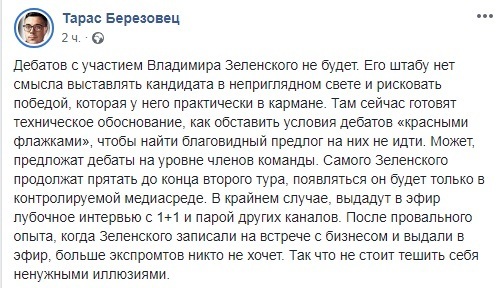 Впрочем, политолог Тарас Березовец отметил, что штаб Владимира Зеленского не допустит проведения дебатов между актером и Петром Порошенко, так как команда шоумена не станет рисковать победой.