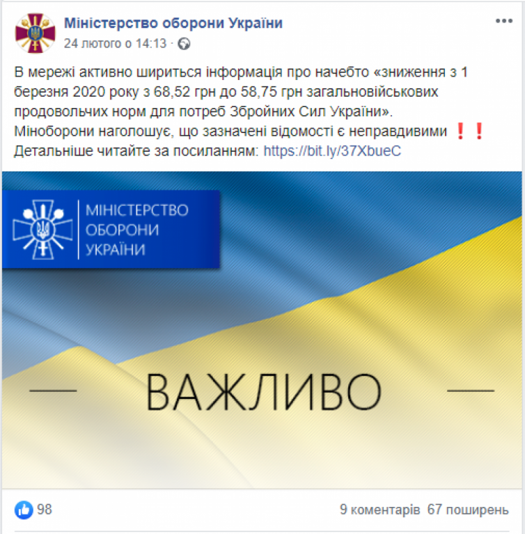 Автор статьи обратился в Главное управление развития и сопровождения материального обеспечения ВСУ с просьбой опровергнуть или подтвердить приведенную выше информацию, после чего на странице Министерства обороны появился пост следующего содержания: «Минобороны отмечает, что указанные сведения являются ложными».